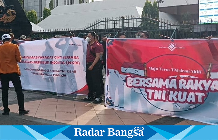 SEMARANG, RadarBangsa.co.id – Ratusan massa yang tergabung dalam Aliansi Masyarakat Pecinta Negara Kesatuan Republik Indonesia (NKRI) menggelar aksi damai di depan Kantor Gubernur Jawa Tengah, Jalan Pahlawan, Kota Semarang, Sabtu (29/3/2025). Aksi tersebut bertujuan mendukung pengesahan revisi Undang-Undang Nomor 34 Tahun 2004 tentang Tentara Nasional Indonesia (TNI), yang dinilai penting untuk memperkuat peran dan fungsi TNI di tengah meningkatnya tantangan keamanan nasional dan global.