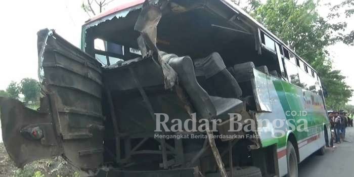 Bus sinar mandiri dengan nomor polisi N 7426 UG ini mengalami kecelakaan di jalur pantura, tepatnya di Desa Compreng, Kecamatan Widang, Kabupaten Tuban, Jumat (20/12). Badan bus bagian belakang menganga setelah terlibat kecelakaan dengan sebuah truk.