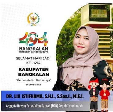 BANGKALAN, RadarBangsa.co.id – Anggota Dewan Perwakilan Daerah (DPD) Republik Indonesia, Dr. Lia Istifhama, S.H.I., S.Sos.I., M.E.I., menyampaikan ucapan selamat kepada seluruh warga Bangkalan. Menurutnya, momentum hari jadi menjadi waktu yang tepat untuk mengevaluasi capaian pembangunan dan memperkuat identitas budaya daerah.
