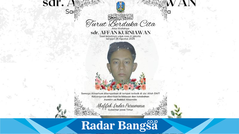 SURABAYA, RadarBangsa.co.id – Pemerintah Provinsi Jawa Timur mengajak masyarakat luas untuk bersama-sama melaksanakan sholat ghoib bagi almarhum Affan Kurniawan. Doa bersama ini dijadwalkan berlangsung usai sholat Isya berjamaah di Masjid Nasional Al Akbar Surabaya, Jumat (29/8/2025).