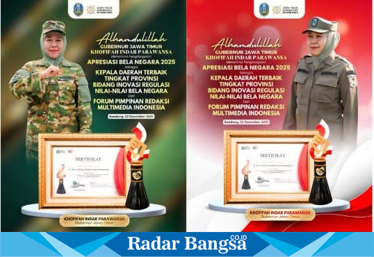 SURABAYA, RadarBangsa.co.id — Komitmen Pemerintah Provinsi Jawa Timur dalam menghidupkan nilai-nilai bela negara kembali mendapat pengakuan nasional. Gubernur Jawa Timur Khofifah Indar Parawansa meraih Penghargaan Kepala Daerah Terbaik Tingkat Provinsi Bidang Inovasi Regulasi Nilai-Nilai Bela Negara dari Forum Pimpinan Redaksi Multimedia Indonesia (FPRMI).