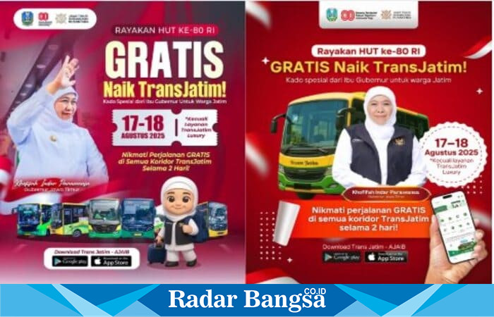 SURABAYA, RadarBangsa.co.id – Pemerintah Provinsi Jawa Timur akan menggratiskan layanan Bus Trans Jatim selama dua hari penuh pada 17–18 Agustus 2025 sebagai bagian dari peringatan Hari Ulang Tahun (HUT) ke-80 Kemerdekaan Republik Indonesia. Kebijakan ini diumumkan langsung oleh Gubernur Jawa Timur Khofifah Indar Parawansa di Surabaya, Kamis (14/8).