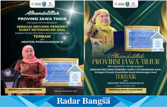 SURABAYA, RadarBangsa.co.id – Pemerintah Provinsi Jawa Timur kembali menorehkan prestasi nasional dengan meraih penghargaan Instansi Penerbit Surat Keterangan Asal (IPSKA) Award 2025 dari Kementerian Perdagangan Republik Indonesia. Penghargaan bergengsi ini diberikan atas kinerja unggul Pemprov Jatim dalam penerbitan Surat Keterangan Asal (SKA) atau Certificate of Origin (COO), yang menjadi dokumen penting bagi eksportir dalam memperoleh pembebasan atau pengurangan tarif bea masuk di negara tujuan ekspor.