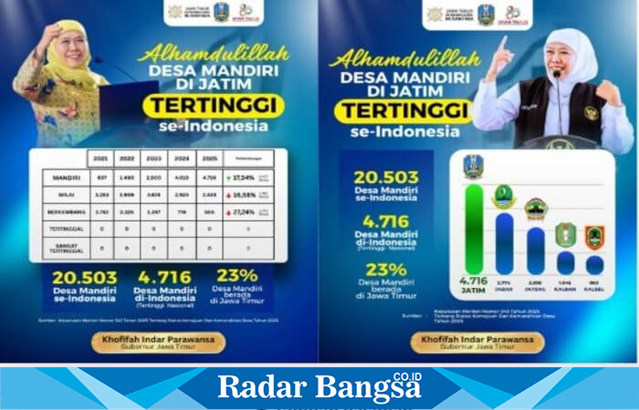 Jumlah tersebut meningkat 17,34 persen dibandingkan tahun 2024, ketika desa mandiri di Jawa Timur baru mencapai 4.019 desa. Capaian ini menegaskan peran Jawa Timur sebagai kontributor utama dalam kemajuan pembangunan desa di Indonesia.