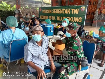 Kodim 1610/Klungkung bersinergi dengan Dinkes Klungkung, dan sebelum melakukan vaksinasi, tim kesehatan melaksanakan screening, cek suhu tubuh, cek tensi dan setelah dinyatakan sehat baru bisa di suntik,