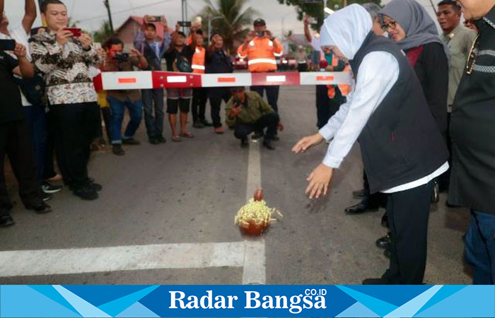 BANYUWANGI, RadarBangsa.co.id – Gubernur Jawa Timur, Khofifah Indar Parawansa, secara resmi meresmikan pintu perlintasan Kereta Api dan Pos Jaga jalur perlintasan langsung (JPL) 79 KM 63 +974 di jl. Aruji Karta Winata, Desa Gumirih, Kecamatan Singojuruh, Kabupaten Banyuwangi. Acara peresmian ini disertai dengan penekanan sirine dan pemecahan kendi oleh Gubernur Khofifah, didampingi oleh Bupati Banyuwangi, Ka. Dinas Perhubungan Provinsi Jawa Timur, serta Forkopimda Kabupaten Banyuwangi, pada hari Sabtu (16/12),